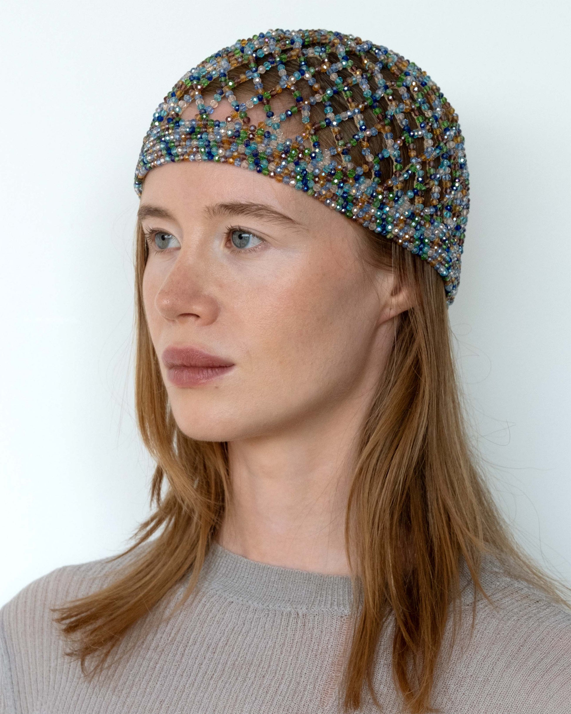 Hand-embroidered hat made out of glass beads in a multicolour colourway.